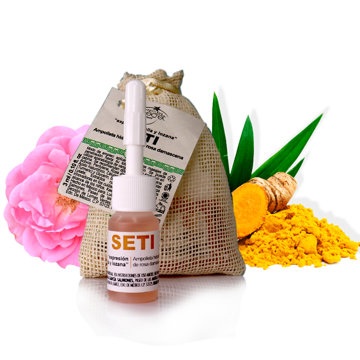 INGREDIENTES: Pentylene, Rosa damascena Flower Water, Ácido hialurónico, Células madre de Cúrcuma longa (Turmeric) y Glycerin, Sarcocapnos crassifolia Callus Lysate; Extractos naturales de propiedades innovadoras en los cuidados